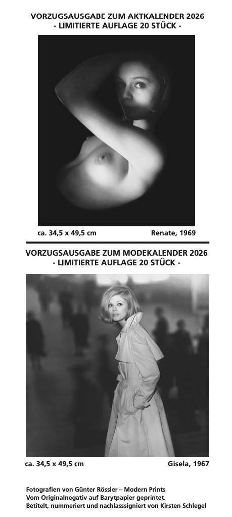 Mit diesen Kalendern 2026, anlässlich des 100. Geburtstages von Günter Rössler, erinnern wir uns an einen großen Fotografen und sehr besonderen Menschen. Ausgewählt sind 13 Fotografien, Klassiker, die Günter Rössler für sehr wichtig hielt, die ihn berührten.
